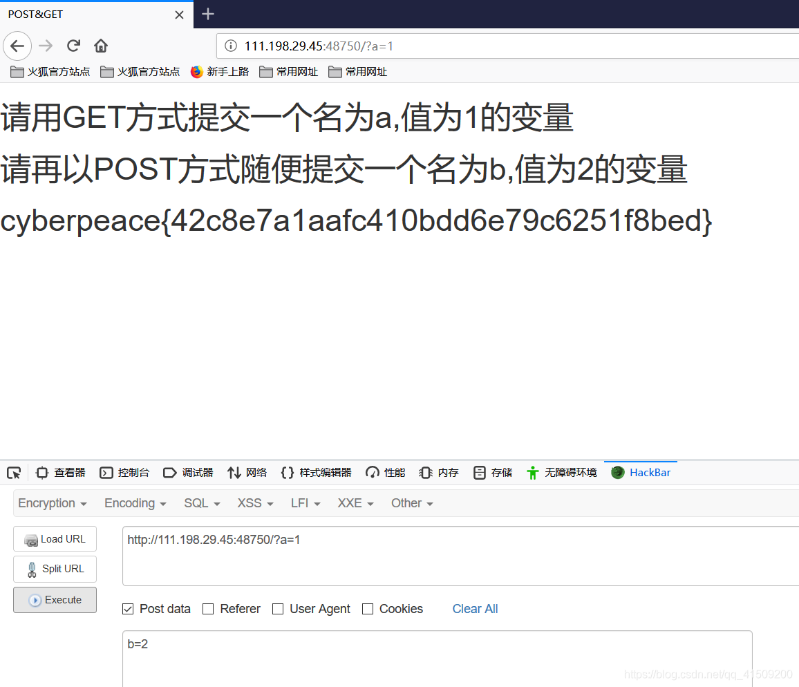 最后,点击Post data,并在下方输入b=2,点击Execute,便得到flag