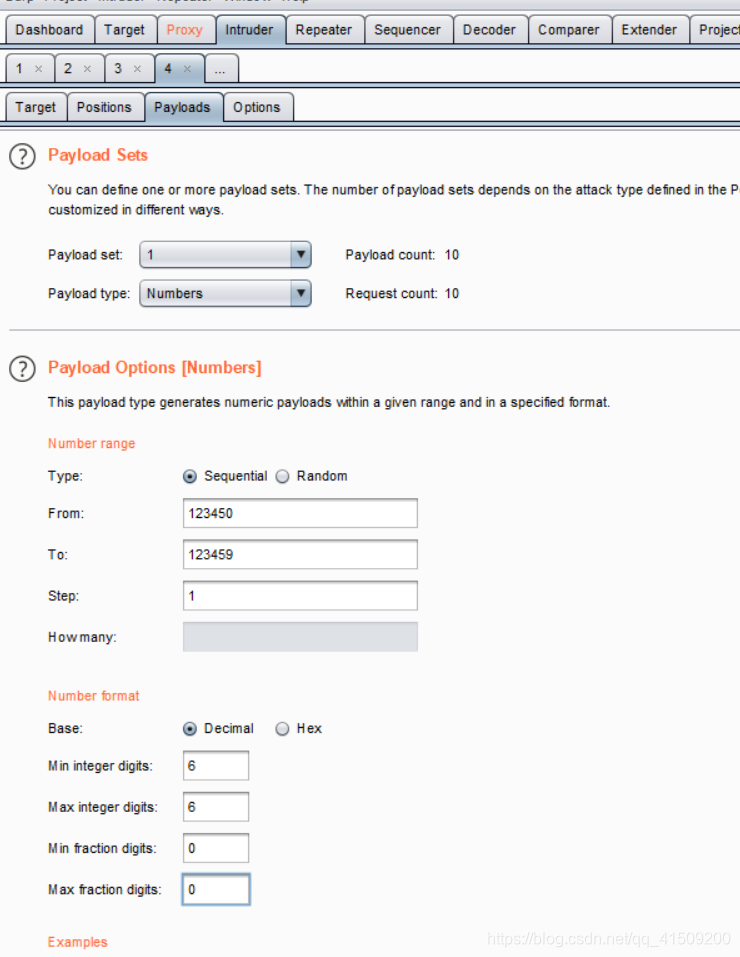 接着,再将其发到Intuder中并点击Clear§和Add§,并设置如下参数进行暴力破解