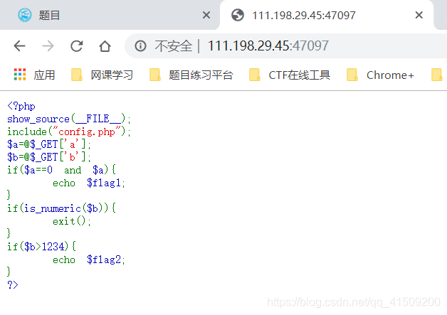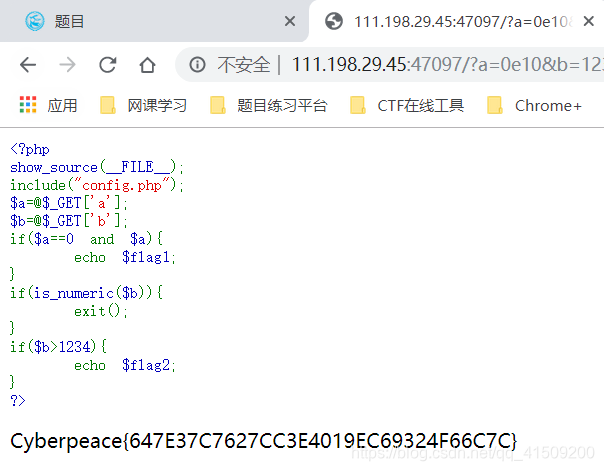 首先,以GET方式获得两个参数a和b,如果a和b满足一定条件,则打印flag1和flag2,猜测将flag1和flag2拼接就能够得到完整flag