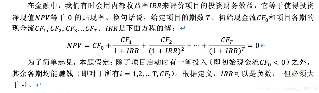 题目两边等式同乘 (1+IRR)T。则原题相当于求:CF0(1+IRR)T+CF1(1+IRR)T−1+⋯+CFT=0 的解,则可使用二分法。