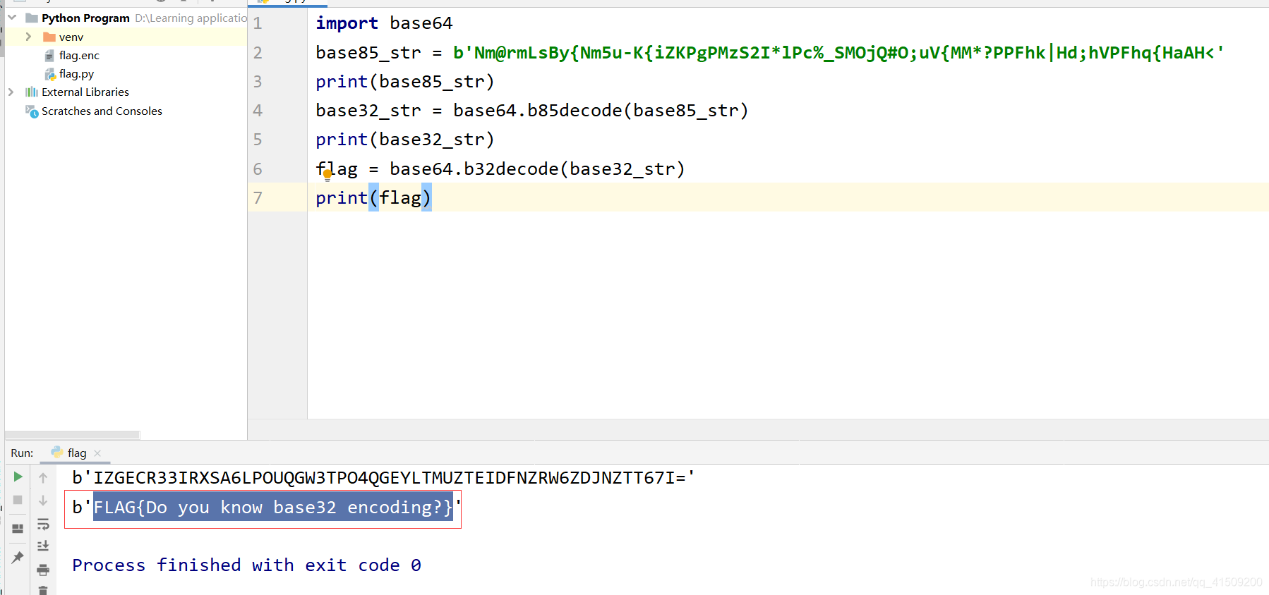 题目提示我们在python3的手册中查找base64的用法,上面的字符串先base85解密,再base32解密即得flag