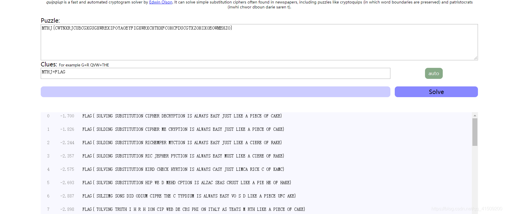 提示说要用替换加密,于是找到了一个在线网站解密即得flag