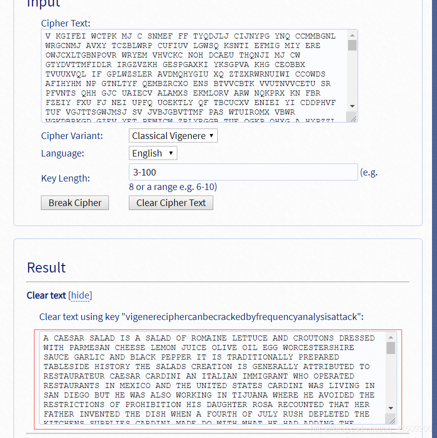 题目是一堆大写英文字母,提示说用维吉尼亚解密来做,于是找个在线网站来解密,得到红框中的内容