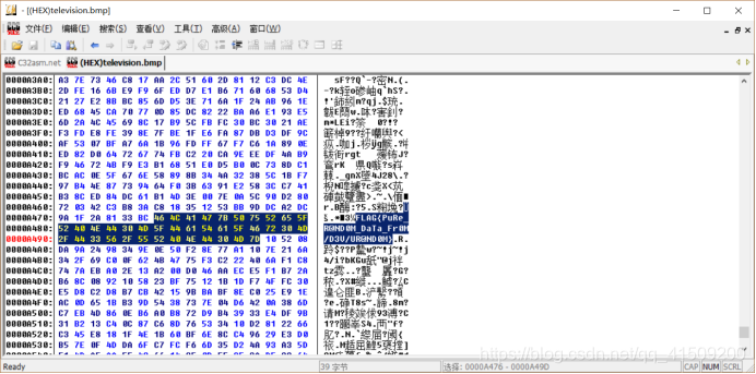 打开题目链接后是一张bmp图片,估计就是图片隐写的题目,下载下来后用binwalk没发现异样,然后用C32ASM搜索flag时找到了答案