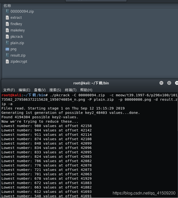 于是这个zip存在明文攻击,于是把压缩00000000.png得到的plain.zip和00000094.zip放到pkcrack的文件夹下,利用命令