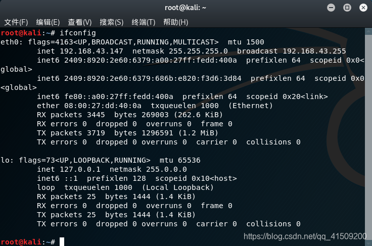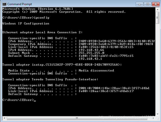 在命令行下看看现在的ip,我现在的ip是192.168.43.66
