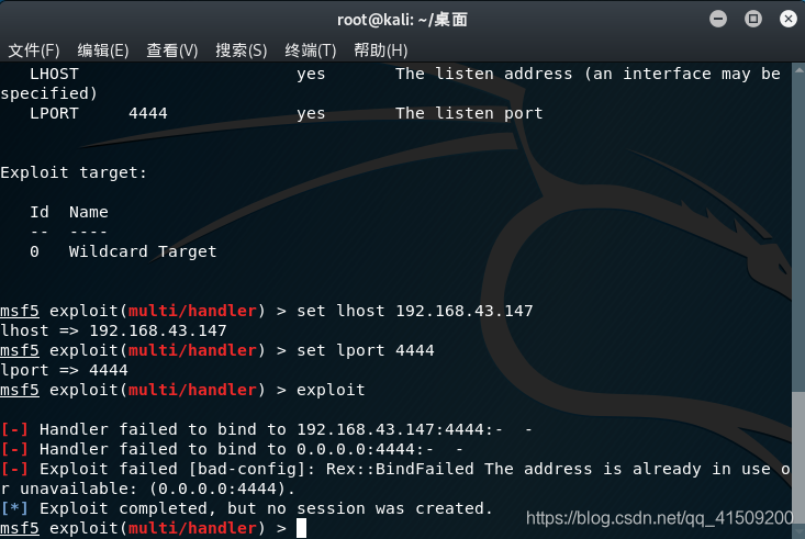 Exploit completed, but no session was created.在浏览器中搜索有人说让重写启动一下 metesploit 的数据库,还有人说是 windows 的版本问 题,反正我就成功渗透了 win7 一次,结果还忘了给截屏了,其他的全部以失败告终。 - 攻击 win10 的时候,有人说要用 TheFatRat,我也尝试了好多次,终究没成功,好不容易 找到了利用